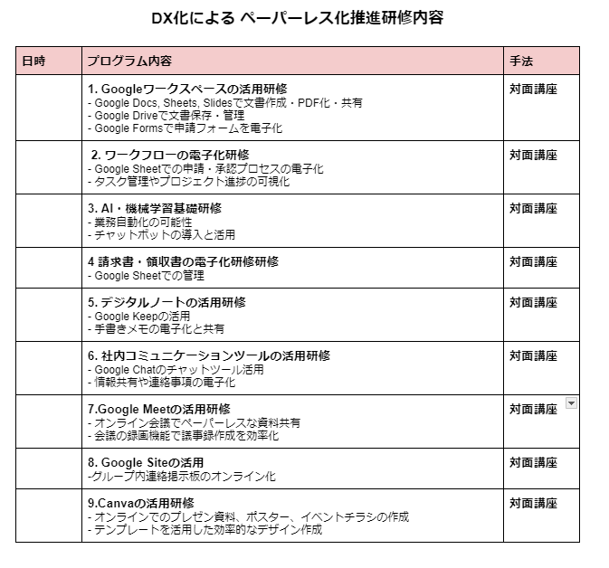 ここでは“Google Work Space””Canva””Gemini”などのクラウドサービスとAIの活用方法で業務の効率化最適化について学んでいただき企業での活用までの研修を行います。